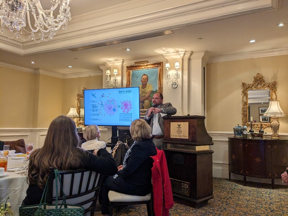 The ARCS Atlanta Chapter General Membership Meeting was held at the Downtown Capital City Club on January 17, 2024. Former ARCS Atlanta Scholar (2013) Dr. Eric DeJesus spoke to ARCS Atlanta members about his research following the receipt of his PhD from UGA. Dr. DeJesus is the founder of Annate Bitherapeutics, a biotech company working to selectively treat a wide range of tumor types through immunotherapies. Dr. DeJesus spoke about how the revelations of African Trypanosomes are changing the cancer landscape.