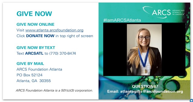 The goal was to draw in new donations, new members, and new engagement from non-members. A texting app was used for raising money in addition to encouraging online donations through the ARCS Atlanta website DONATE NOW bottom. A special thanks to Pat Leake for getting all the scholar videos and Funds Development - Caroline Hardin, Katie Houser, and Lisa Bankoff - for getting the donations texting app set so that 100% of all donations would go directly to the Scholar Fund.