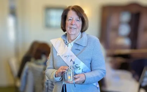 Leslie Petter, ARCS Light 2024 presenting lantern to Sally McDaniel, ARCS Light 2025