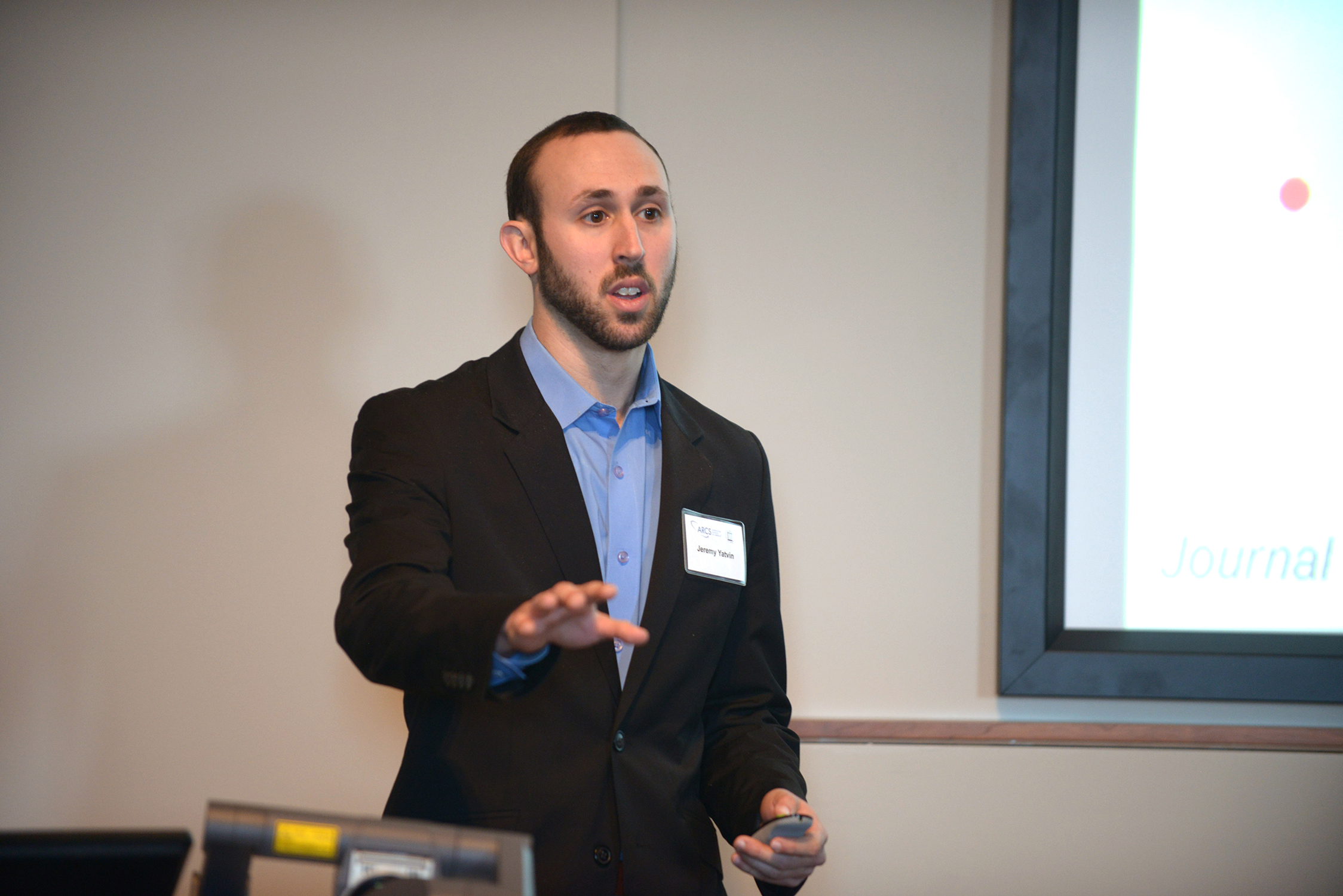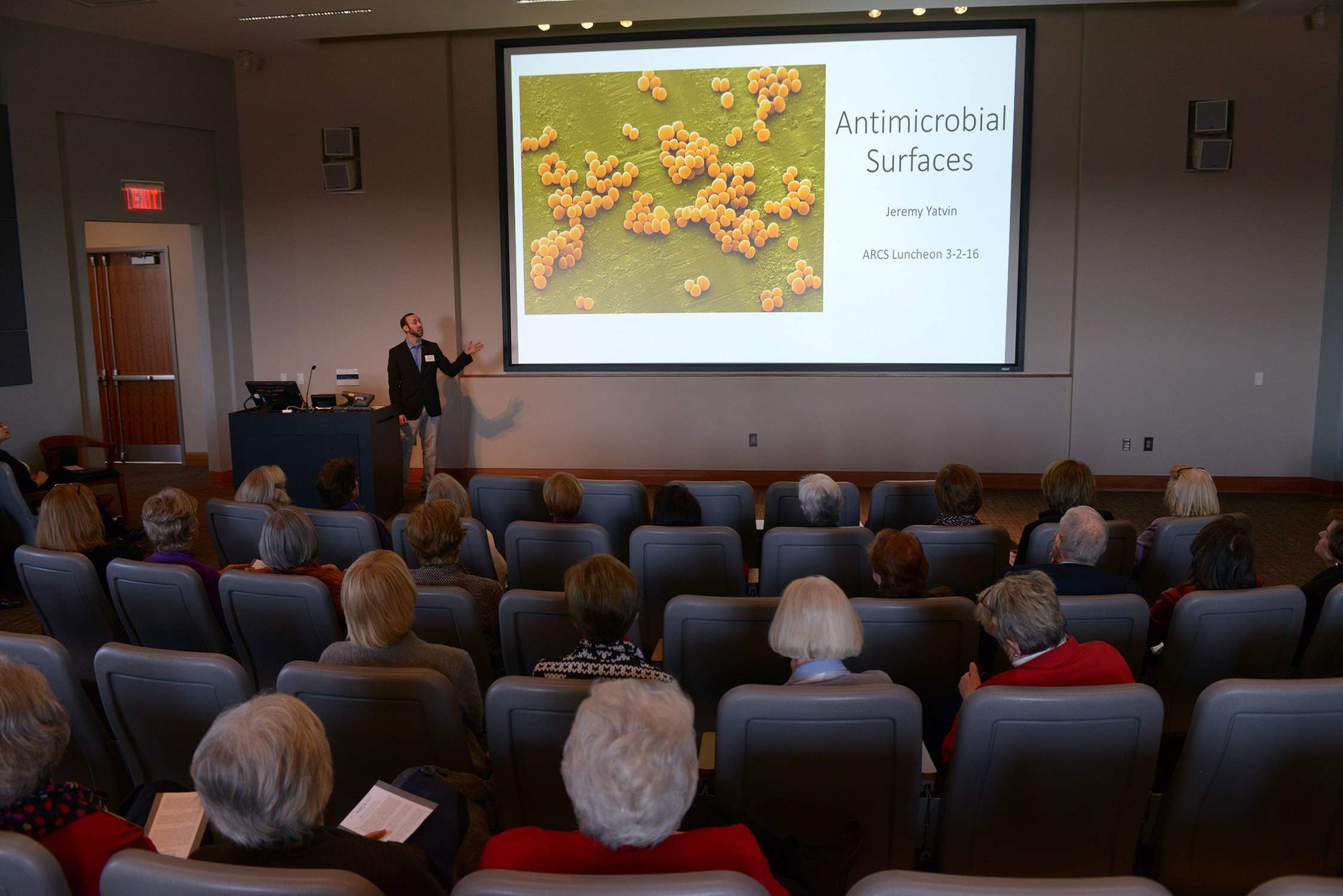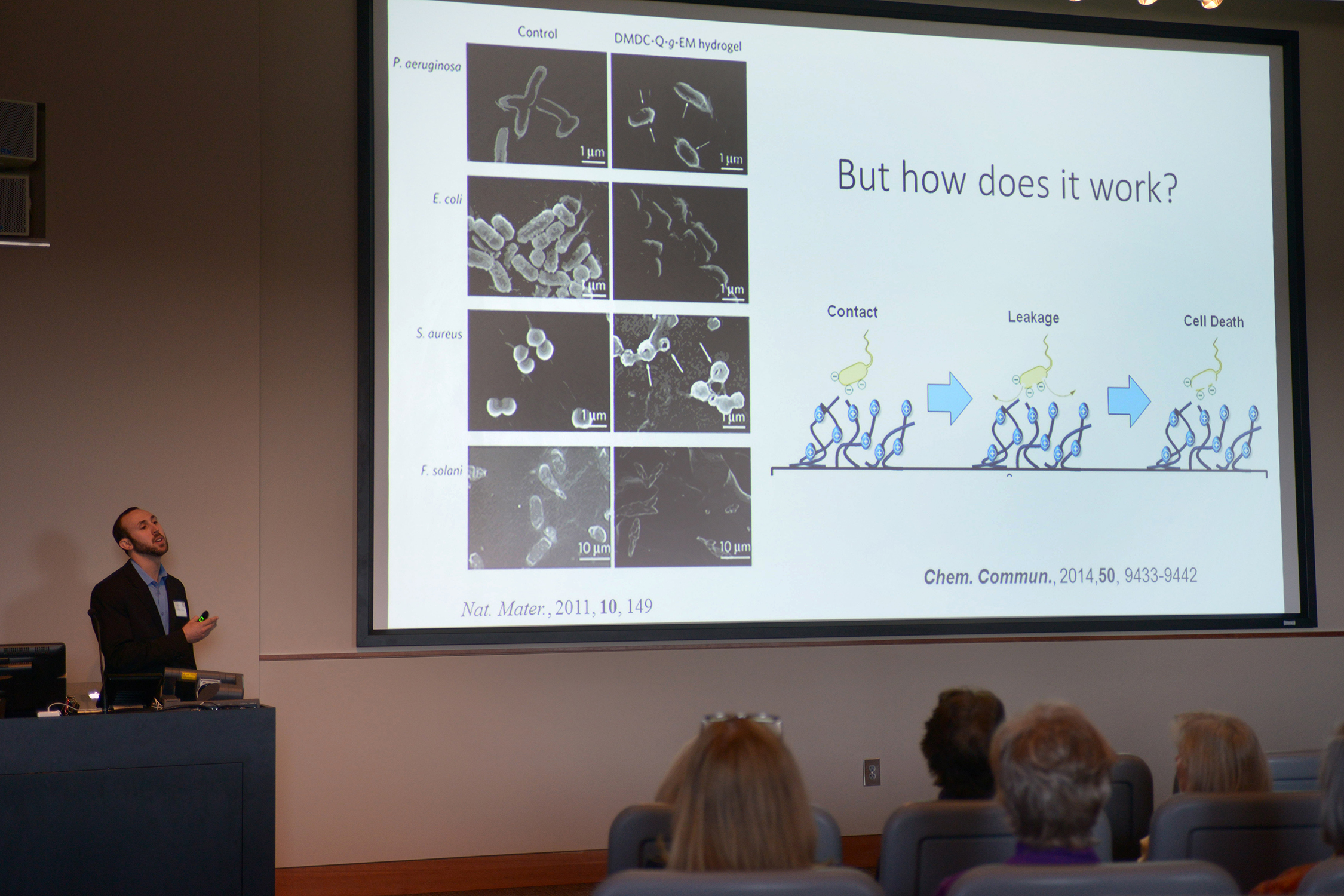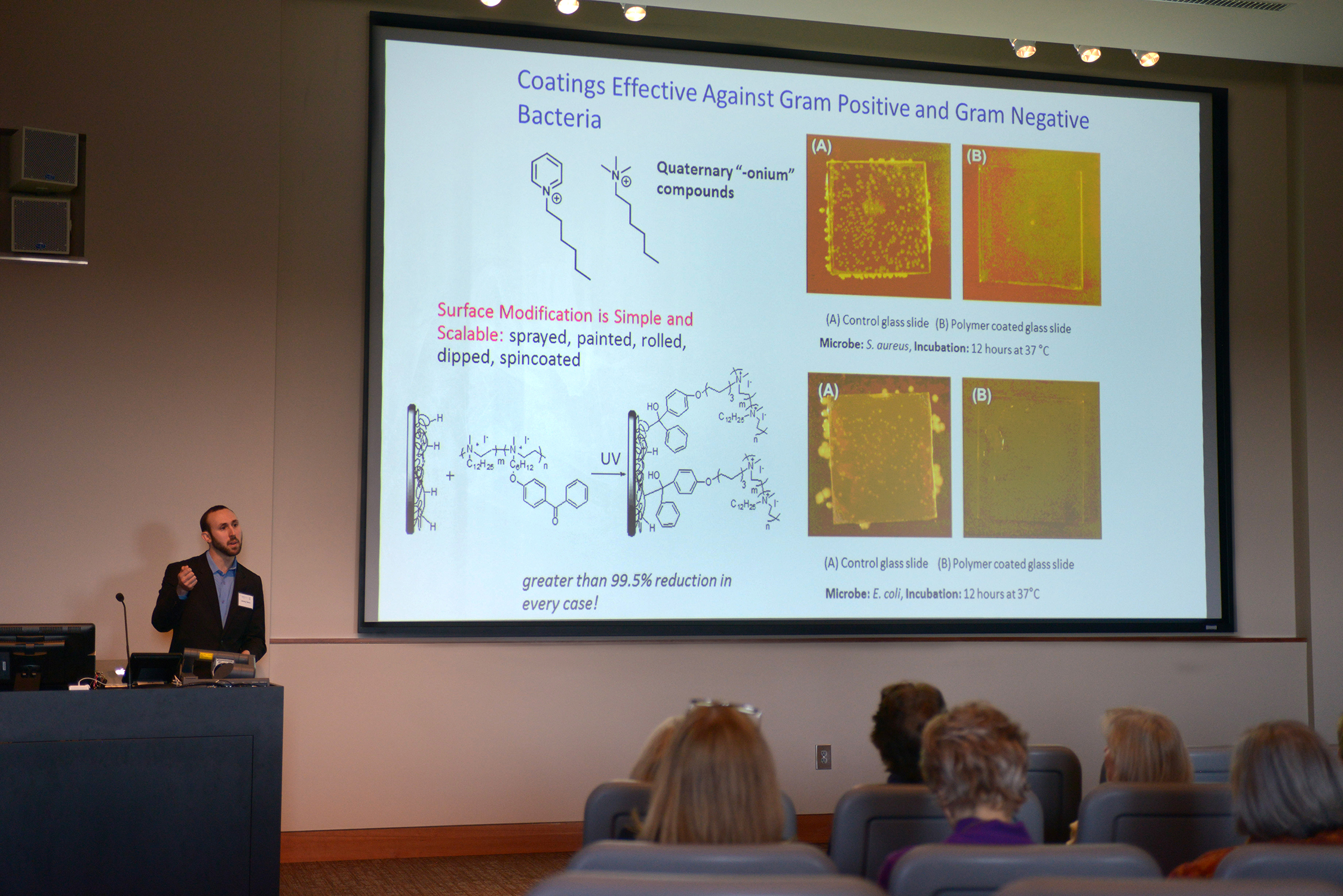 - Jeremy Yatvin a Ph.D. candidate in Chemistry introduced his work on antimicrobial surfaces and their mechanism of action as well as the grafting of fire retardant materials.
